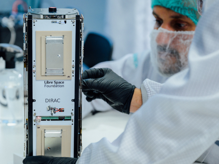 An engineer handles PHASMA-DIRAC, a 3U CubeSat designed and built by the Libre Space Foundation in Athens. Launched in November 2025, the mission is part of Greece's national satellite programme.
